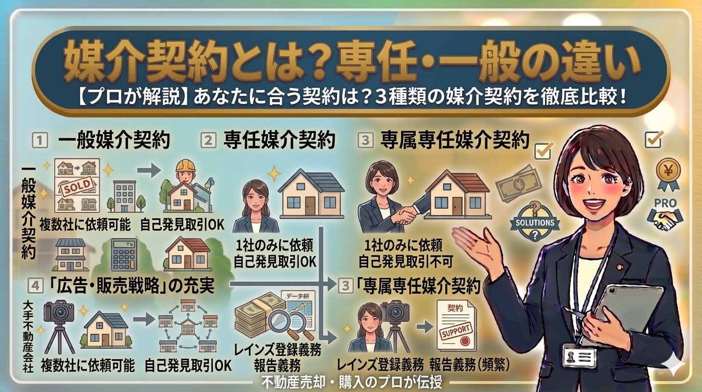 この記事では、媒介契約の基本から専任・一般の違い、どれを選ぶべきかまで、初心者にもわかりやすく解説します。