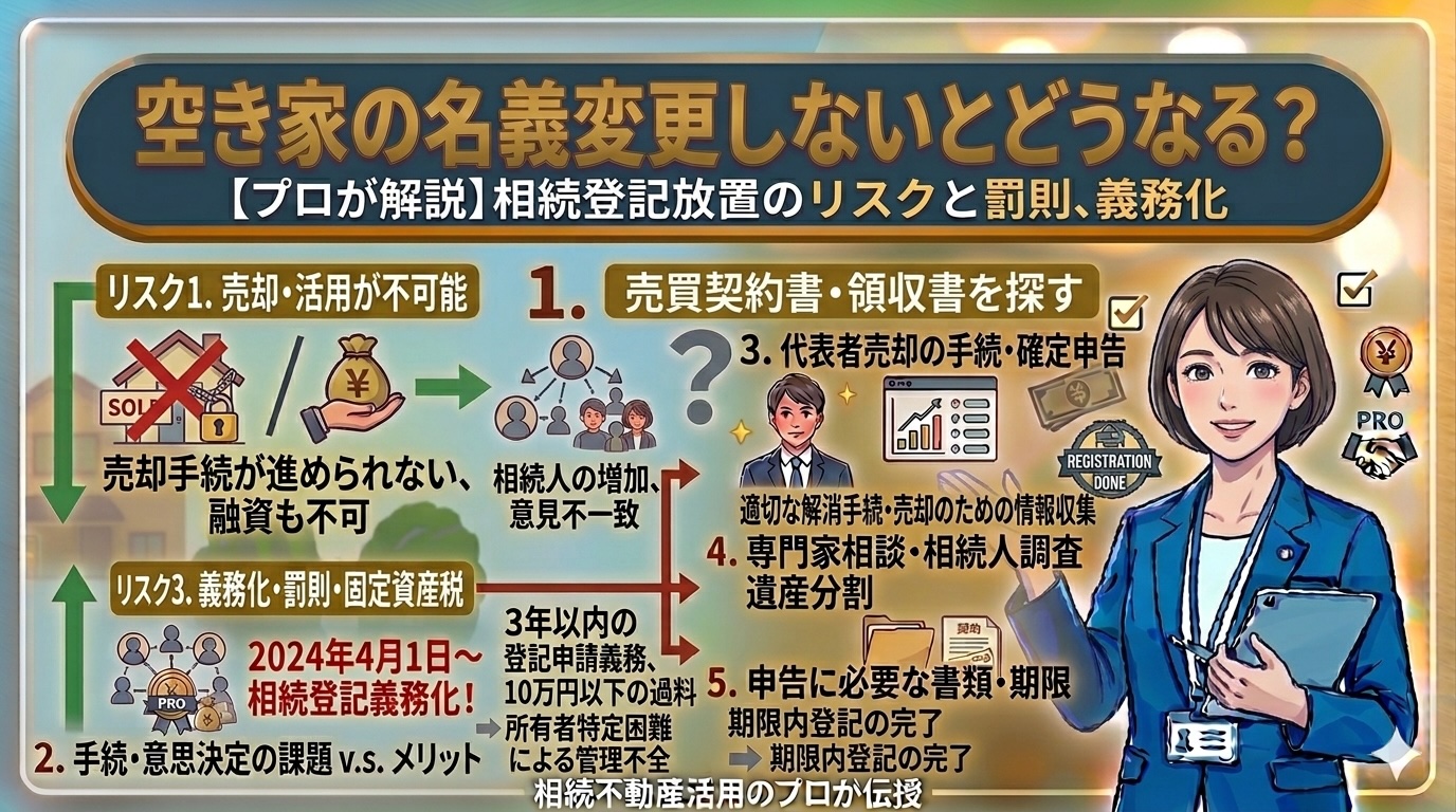 空き家は放置すると価値も下がるため、名義変更を済ませて、売却や活用をスムーズに進めましょう 👍